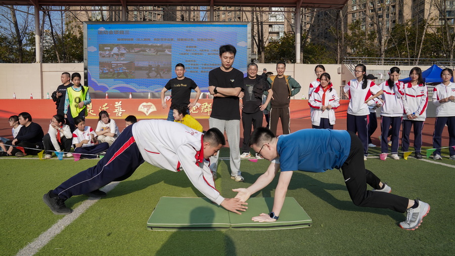 每班选派 6 对家庭组合参赛,比赛过程中,亲子携手闯过各个关卡。在双人跳绳环节,两人配合默契,快速跳跃;俯卧双手击掌时,考验着力量与平衡;背篓接沙包需要精准投掷与灵活接球;背夹球冲刺则要求亲子紧密协作,夹球冲刺,整个过程充满欢笑与挑战。