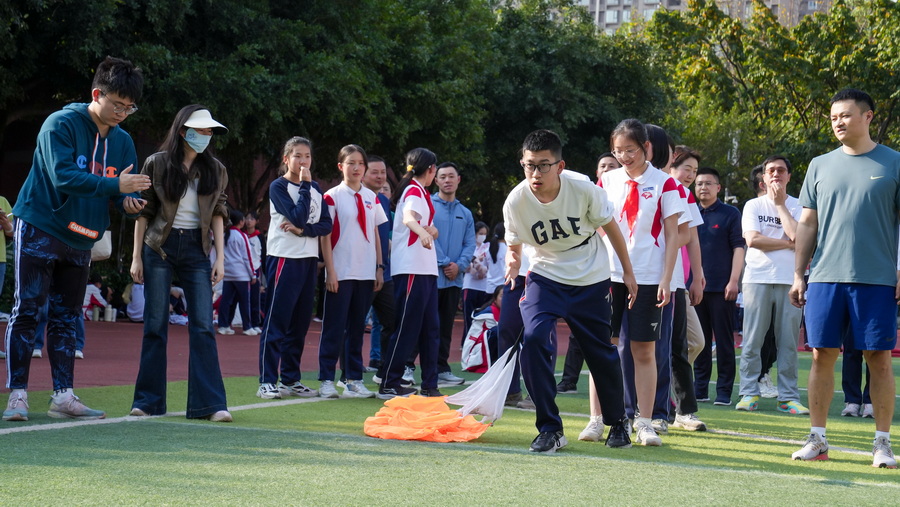阻力伞接力赛同样精彩,每班 6 个家庭组合共 12 名队员分两组分列赛道两端。哨响后,参赛队员穿戴阻力伞道具进行迎面接力。奔跑过程中若阻力伞掉落需捡起再跑,摔跤则罚时 5 秒。赛场上,选手们奋力奔跑,为荣誉而战。