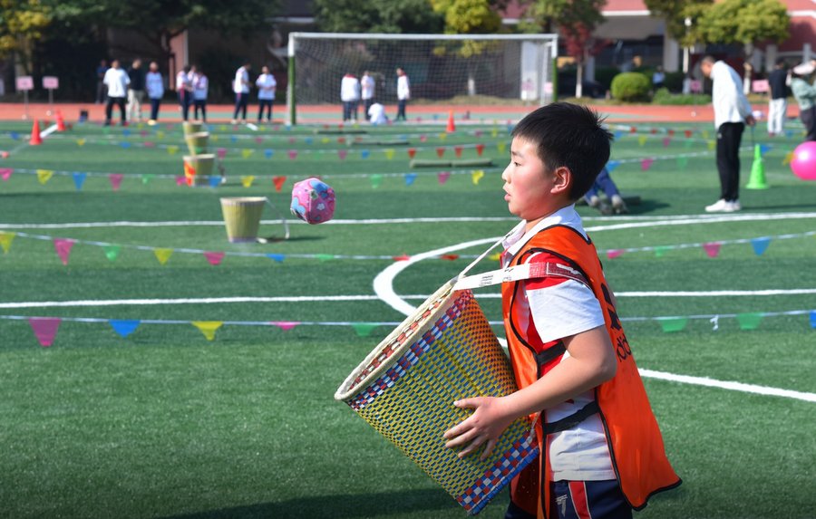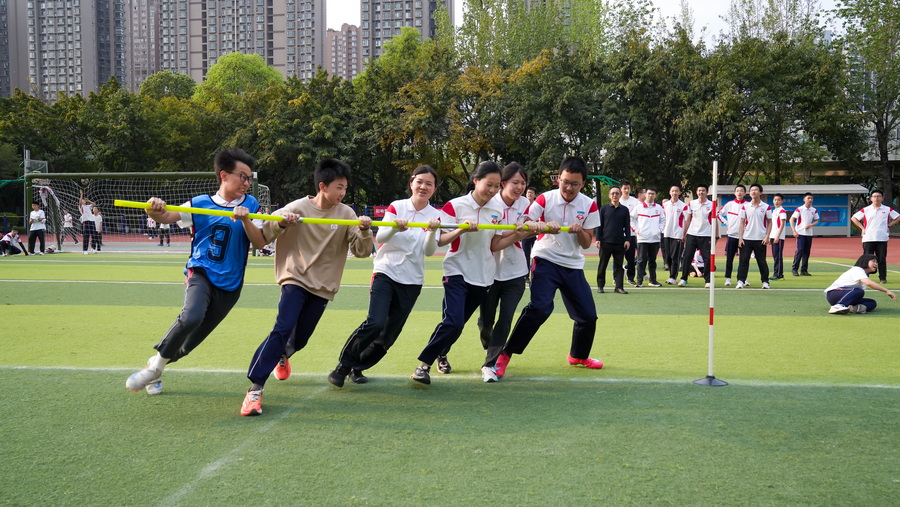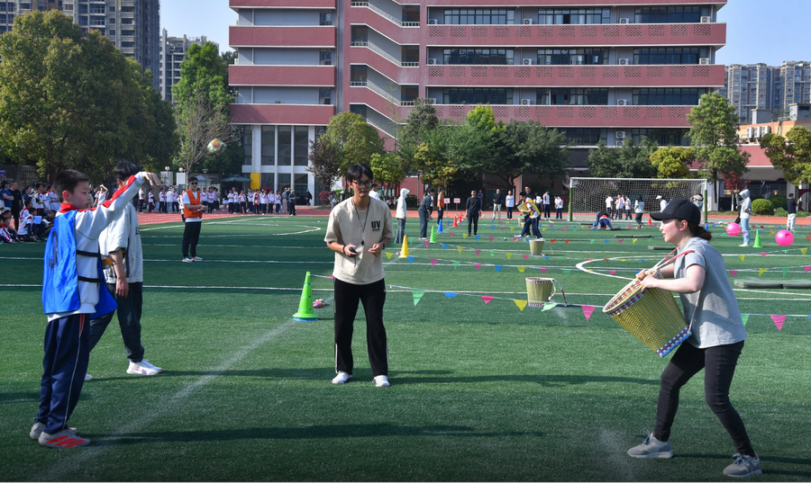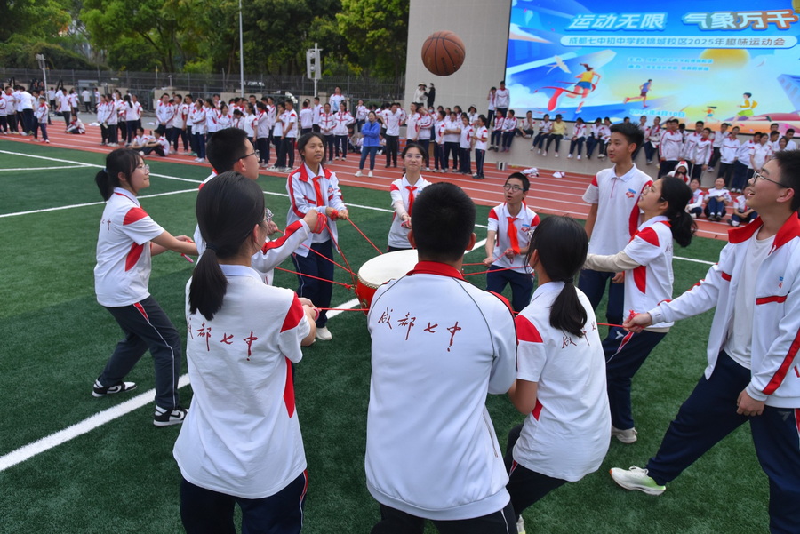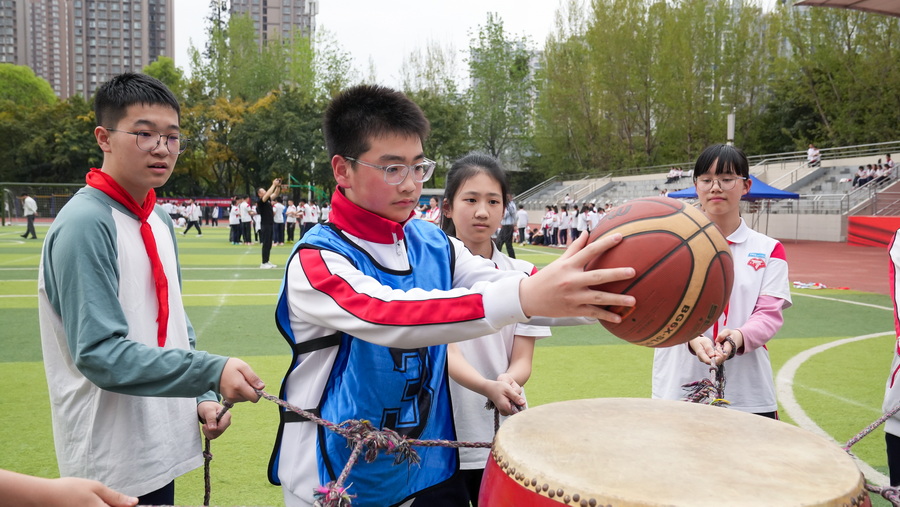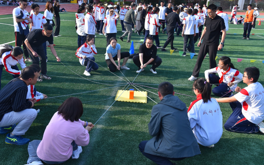 “鼓动人心” 项目极具技巧性,学生们需用力拉紧绳索,精确控制力度和方向,将球垫高。每次球在鼓面上弹起,都能引发现场观众的欢呼。这一项目不仅考验个人技术,更考验团队的合作与应变能力。