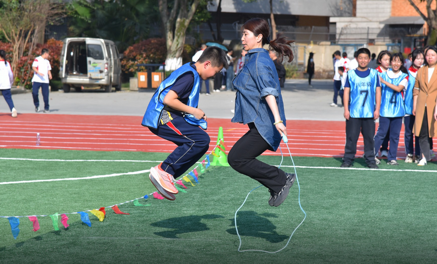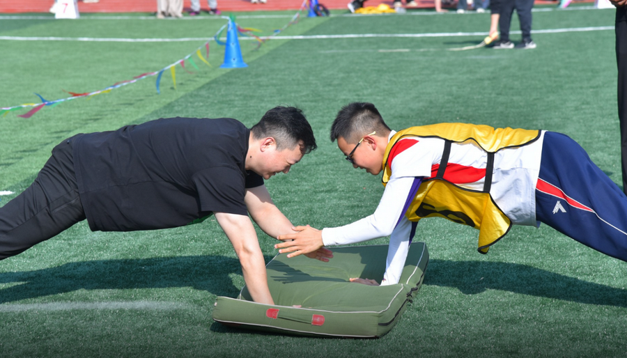 在障碍穿越赛中,赛道长50米,设置有双人跳绳、俯卧双手击掌、背篓接沙包以及背夹球冲刺四个关卡。每个班级派出6对家庭组合参与这场充满挑战的比赛。从连续跳跃到力量与平衡的考验,再到精准投掷和团队协作,每一步都充满了欢笑与汗水。特别是在背夹球冲刺环节,学生和家长需要紧密配合,小心翼翼地夹着充气球向终点冲刺,场面既紧张又温馨。