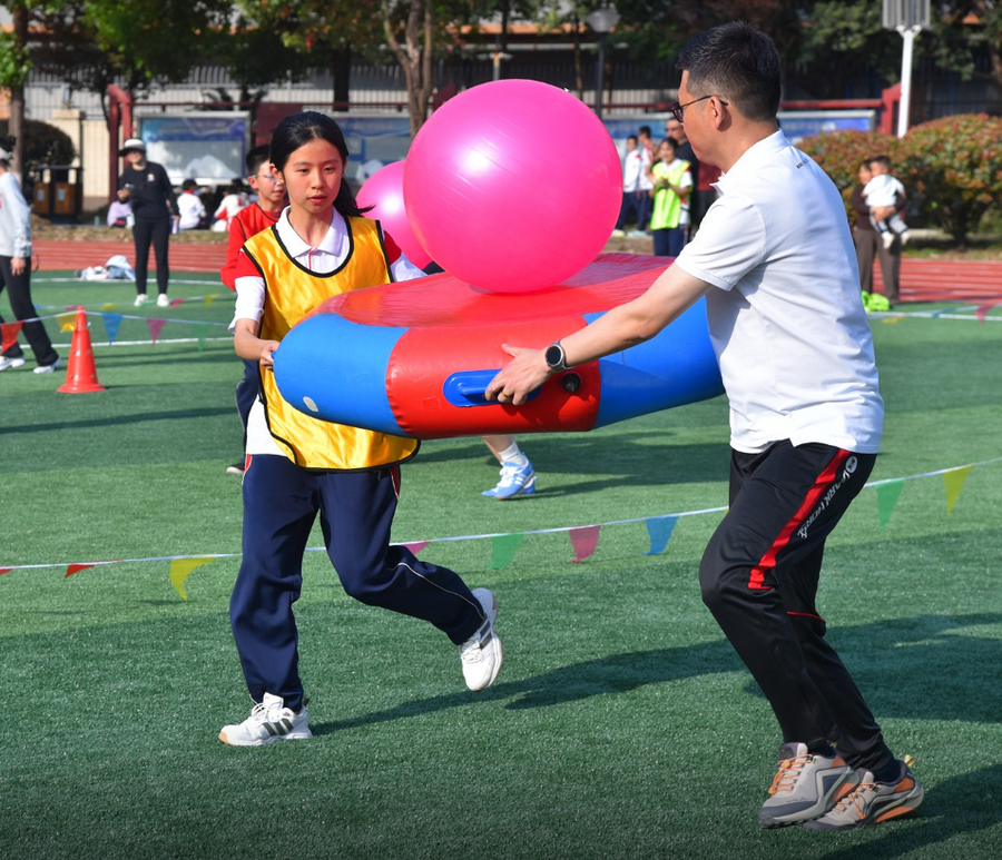 初一年级的亲子趣味运动会上,障碍穿越赛、同心协力接力和阻力伞接力赛成为焦点。这些项目趣味性与挑战性兼具,极大地考验了亲子间的默契、体能及协作能力。