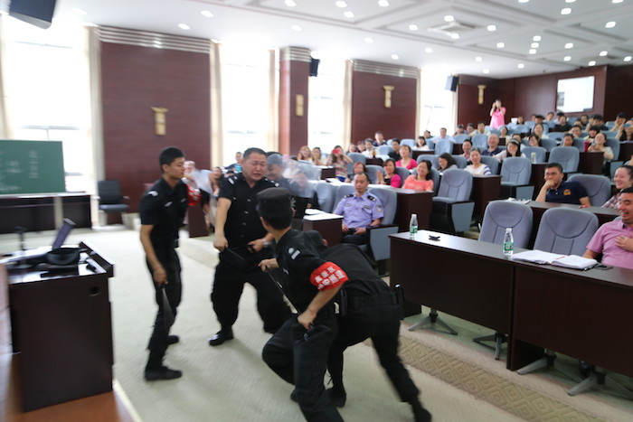 讲座中,成警官指出,首先我们要增强忧患意识和预防意识。做到尽量远离人群密集的地方,因为人群密集的地方往往最容易发生暴力恐怖袭击事件。作为学校,安全保卫工作要做好比较详细的预案,并且成立快速反应小组,以应对突发暴力恐怖袭击事件。此外,学校要加强与辖区公安机关的联系,随时保持通信畅通,以保证警务人员在突发暴力事件发生后5分钟以内赶达现场。他还强调,学校作为一个特殊的场所,尤其在上下学家长接送学生时应加强暴恐事件的预防,做到分工明确,相关负责人员全部在岗。学校在制定详细具体的反恐防暴预案的基础上,定期组织全校师生进行反恐防暴演练,增强师生的反恐防暴能力。接着成警官介绍了应对暴力恐怖事件的防护装备和器械,如盾牌、警棍、钢叉、辣椒水、脚踝控制器等。最后成警官进行了现场演练,他本人亲自担任暴恐分子,请学校几位保安配合,现场演示如何应对暴力恐怖分子,并且演示了两遍。这不仅使全体老师了解了“反恐防暴”知识,还全面提高了老师应对突发暴力事件的能力。成警官的敬业精神也深深打动了在座的老师。