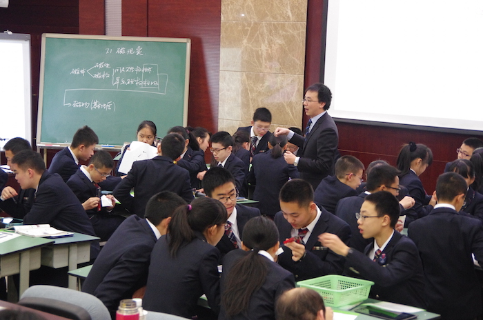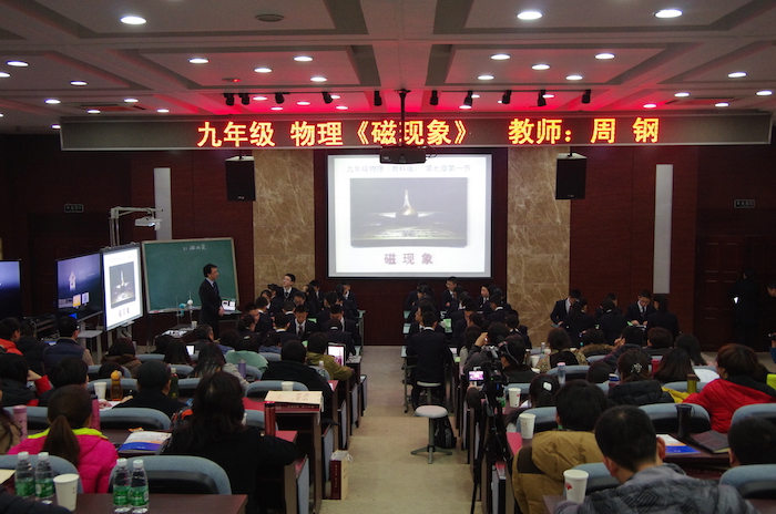 十二月的成都寒风凛冽,但是周钢老师献课的七中初中学术一厅却温暖如春、其乐融融。本堂物理课的内容是教科版九年级上册《磁现象》,上课班级为9年级11班。课前,周钢老师在请与会教师观看了《磁现象》微视频。课堂上,周钢老师首先引导学生回顾了利用微视频所学的知识,并将学生学习后提成的问题归纳为“认识磁体”、“磁场”、“磁感线”3类进行展示。接下来,通过生生互动、师生互动、探究实验等方式解决这些问题。在解决“认识磁体”这部分内容中的问题“磁体被分为两个部分之后是否还存在两级”时,11班学生穆俊曦和谢厚同学利用iPad自导自演拍摄了一段iMovie在课堂上进行展示,赢得老师们的掌声。周钢老师用平易近人的语言、理性严谨的思维引导学生进行关于磁的实验探究,在磁的世界里亲身体验感悟。学生运用云技术,将实验操作过程拍摄下来进行交流和互动,将实验成果拍成照片和教师进行讨论,体现了物理学科特色,同时也展现了现代技术的魅力。