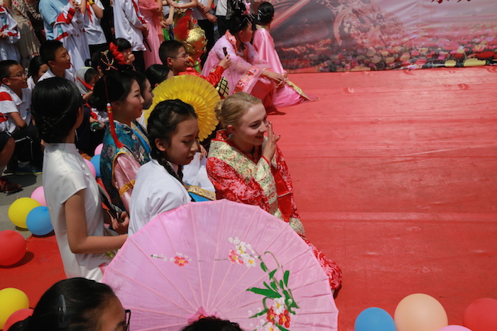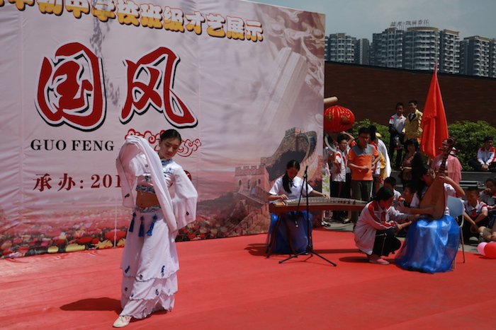 2015年4月3日,我们学校迎来了远方的客人——来自英国杜伦中学的23名师生,并在音乐厅外的小广场举办了以“国风”为主题的初2016级8班班级才艺展示。向英国朋友展示我们中国传统文化的魅力。那天阳光明媚,如同学们的心情——热情似火。