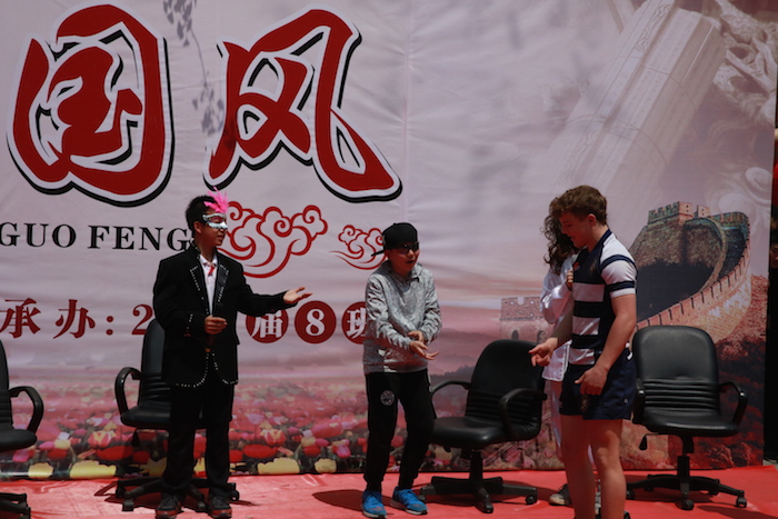 这之后,由李奇润和李宗煜改编的新版《报菜名》更是让同学们捧腹大笑。相信,同学们一定还记得《七初好声音》中罗导师的洒脱,王导师的帅气,陈导师的豪放以及黄导师的幽默,节目中参加了指压板跳远的同学一定也会永远记住那刻骨铭心的触觉。这场展示的压轴大戏,是同学们所展示的《一夕一风华》——中国传统服装秀,当反串的唐朝贵妃和身着汉服的英国同学精彩亮相时,现场更是掌声雷鸣。