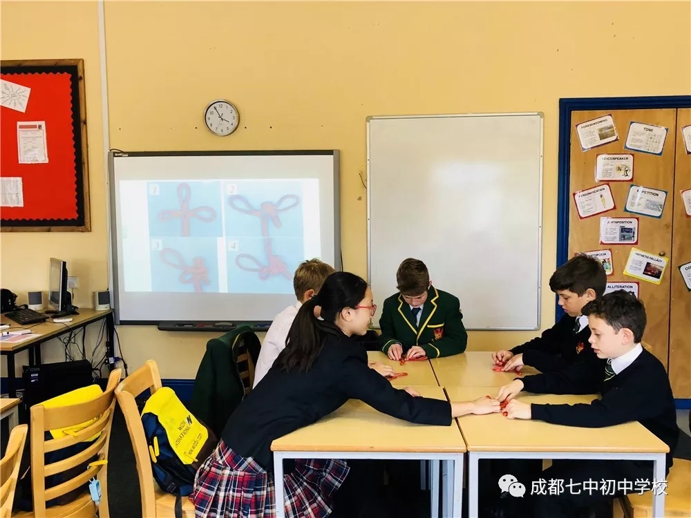 钟莎老师介绍了中国结的做法。在七初同学的细心协助下,一个个可爱的中国结渐渐在英国同学们的手中成型,最后完成作品,拿在手里爱不释手。