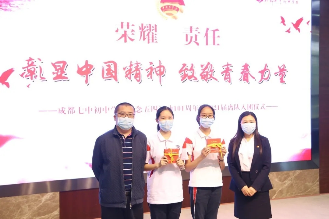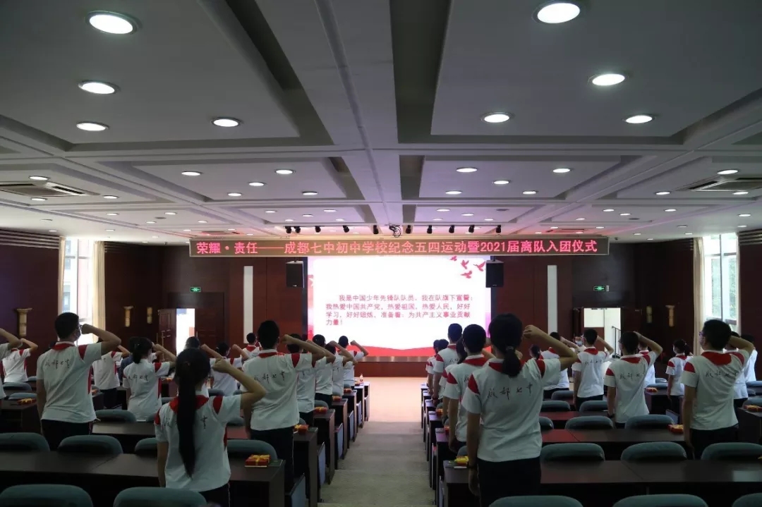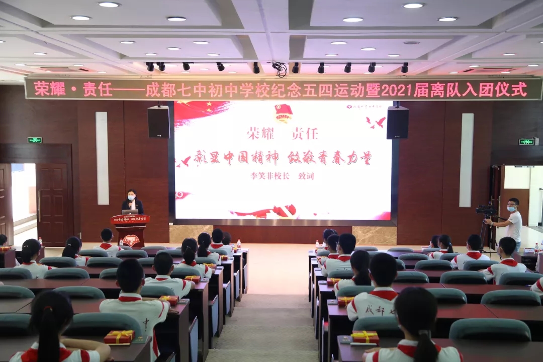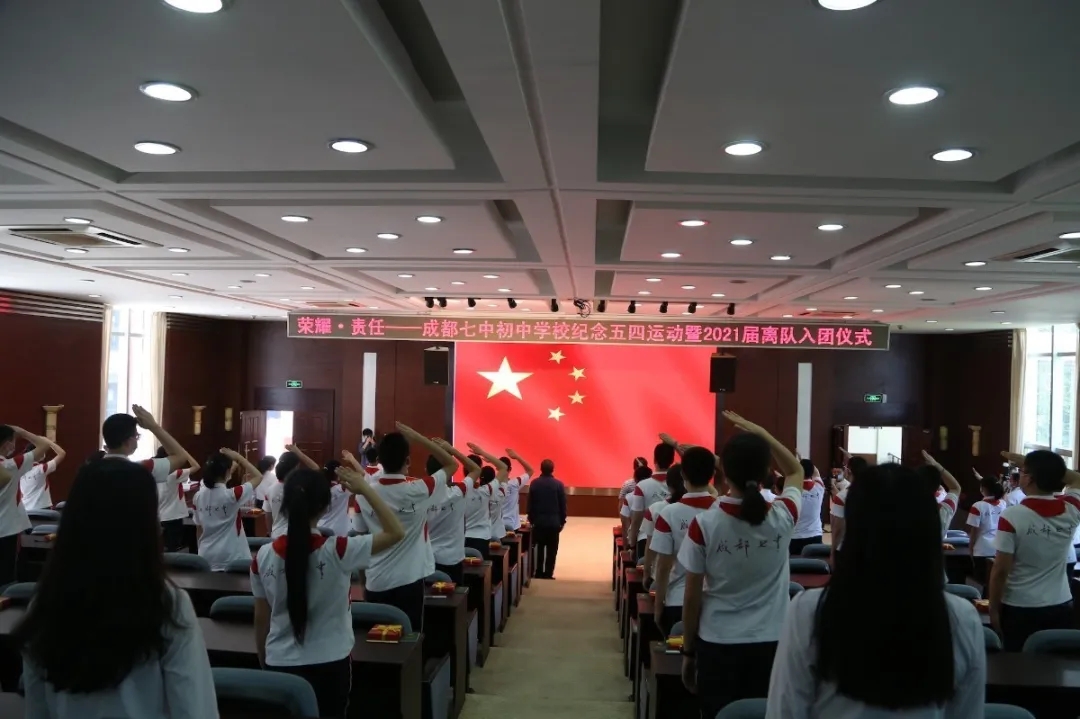 4月30日下午,星空在线登录m星空(中国)隆重举行“纪念五四运动101周年暨2021届离队入团仪式”。疫情期间,活动采取线上直播观看、线下表彰优秀相结合的特殊方式进行,来共同纪念这一重要时刻,学校团委书记何鑫老师主持仪式。来自本部校区和锦城校区的39名2021届优秀同学将在这里离队入团,佩戴上熠熠闪光的团徽,迎接属于他们的荣耀时刻。同时,2021届的全体同学都将褪去少先队员的身份,从少年成长为真正的青年。
