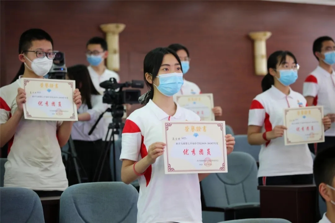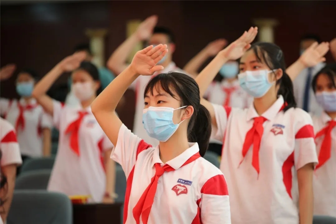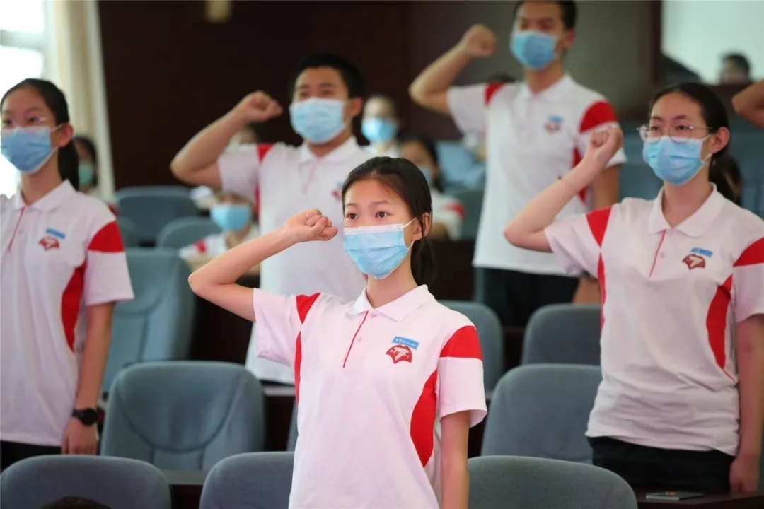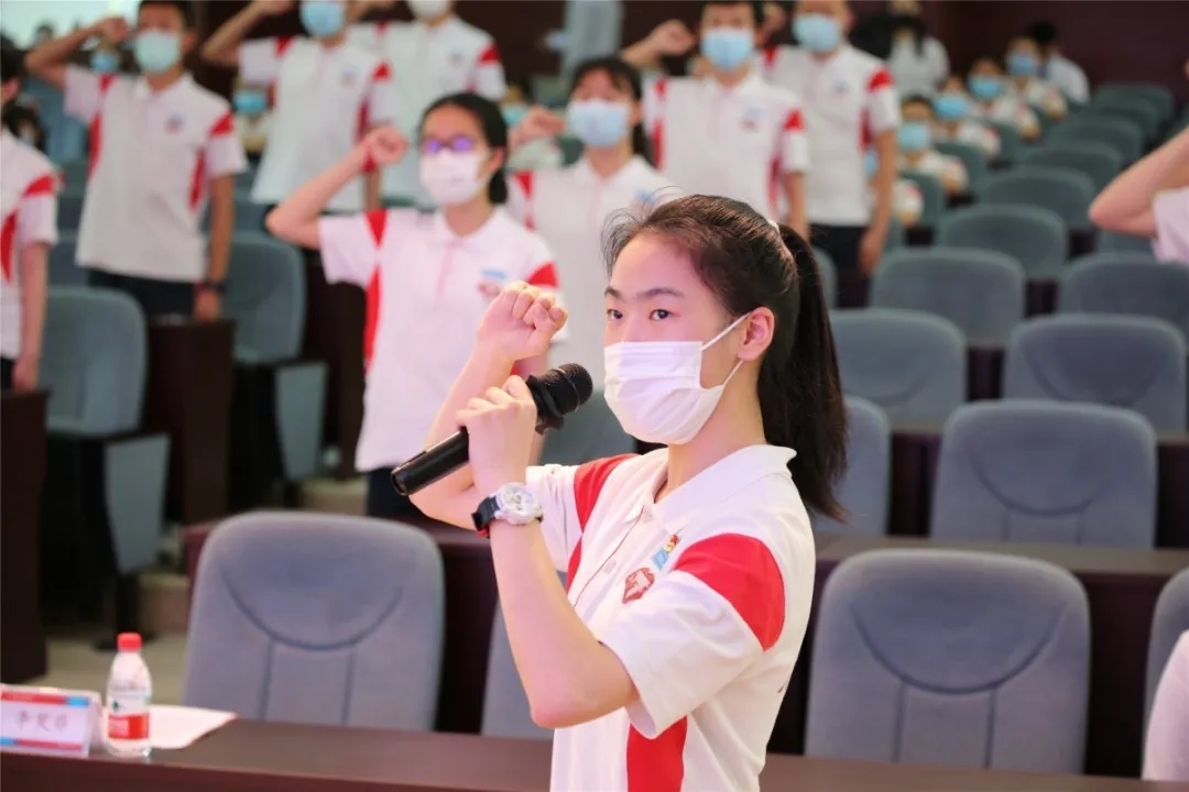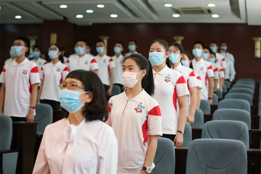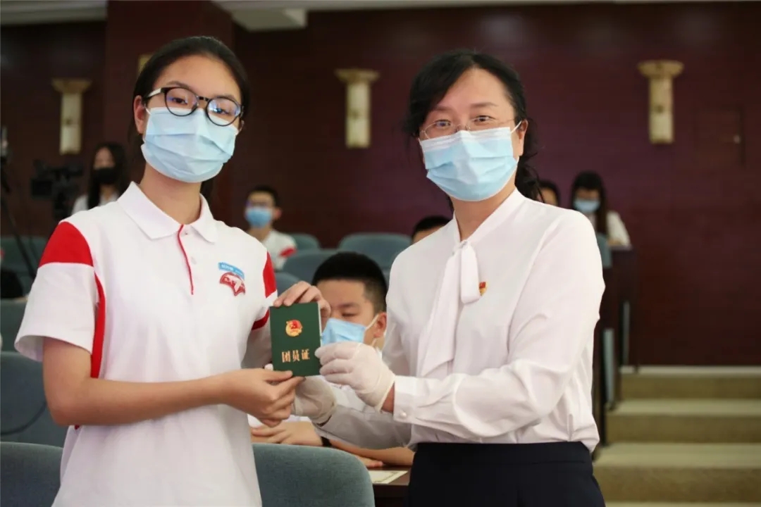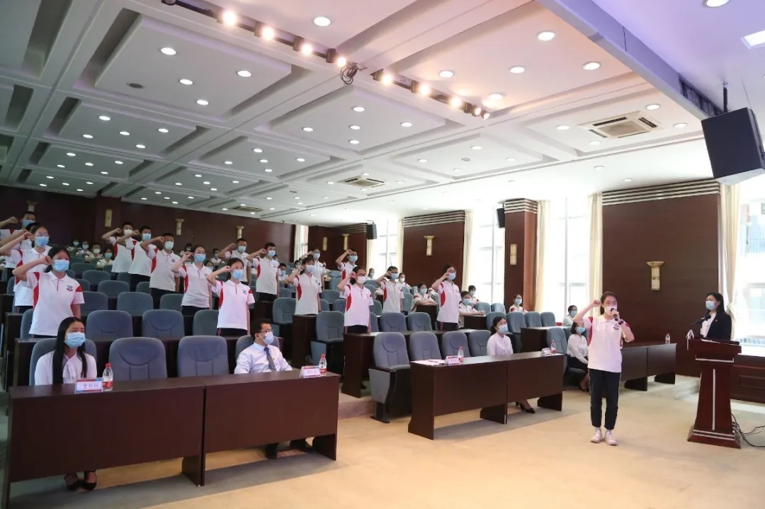 出席活动嘉宾和学校党员教师代表为新团员颁发团徽和团员证书,全体2021届首批团员以青春的名义面对团旗庄严宣誓。