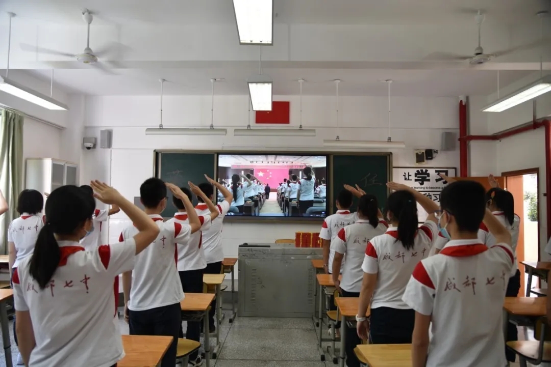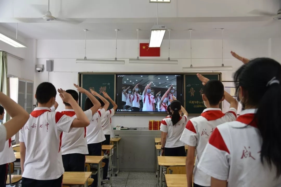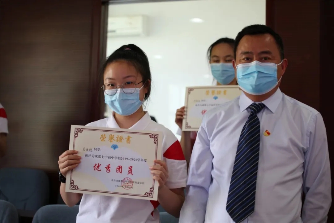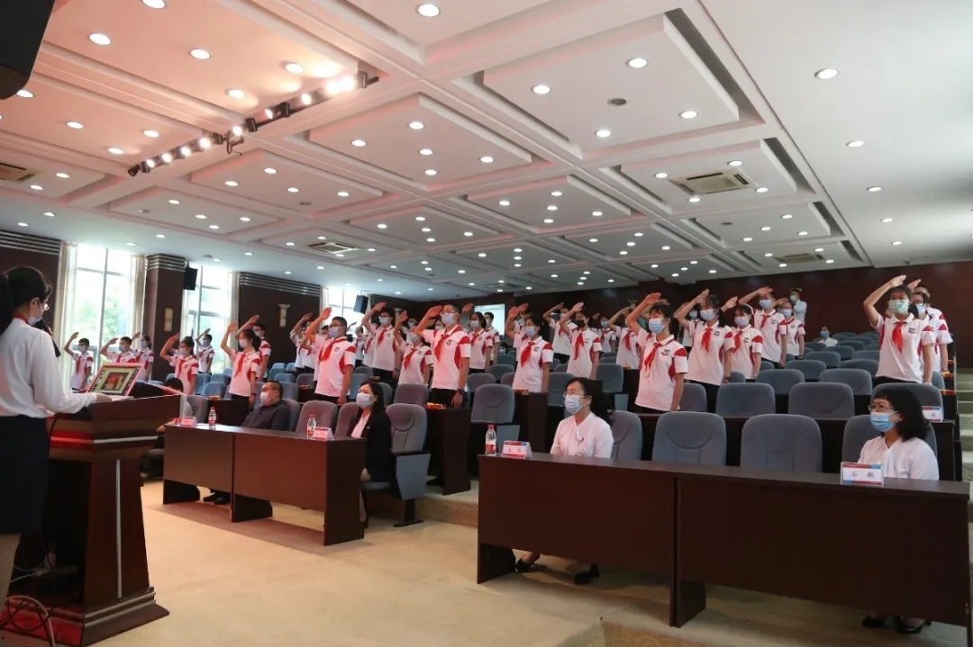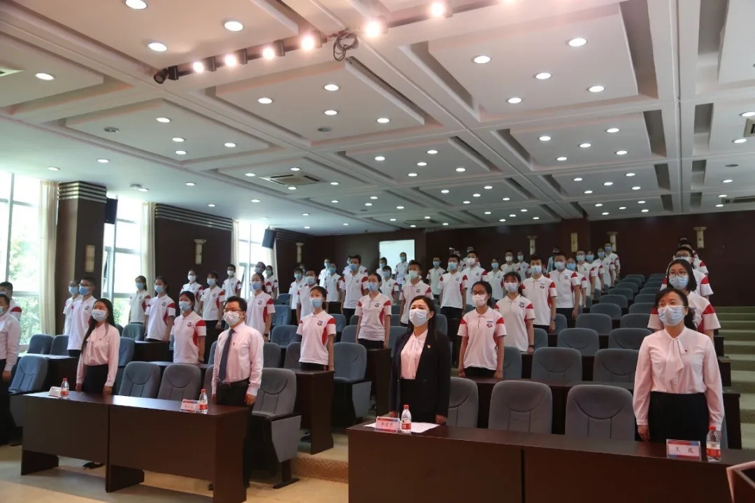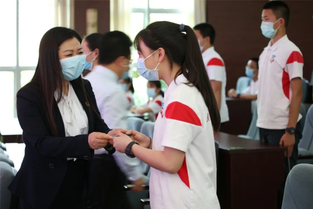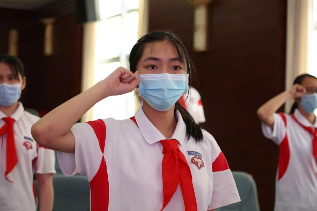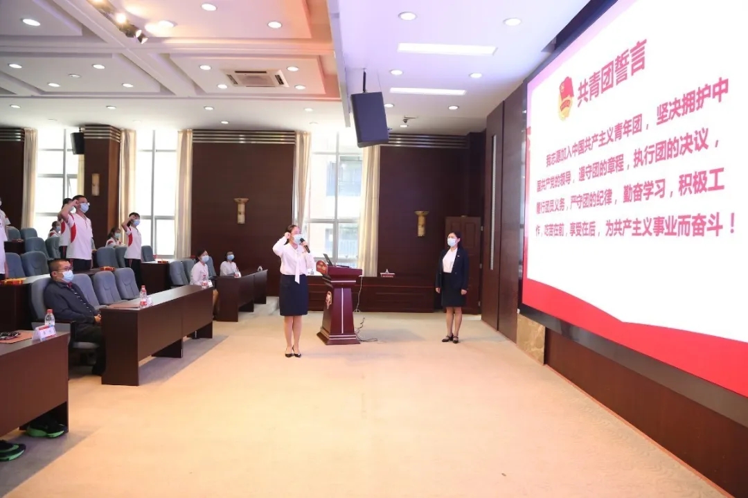 出席活动嘉宾和学校党员教师代表为新团员颁发团徽和团员证书,全体2021届首批团员以青春的名义面对团旗庄严宣誓。