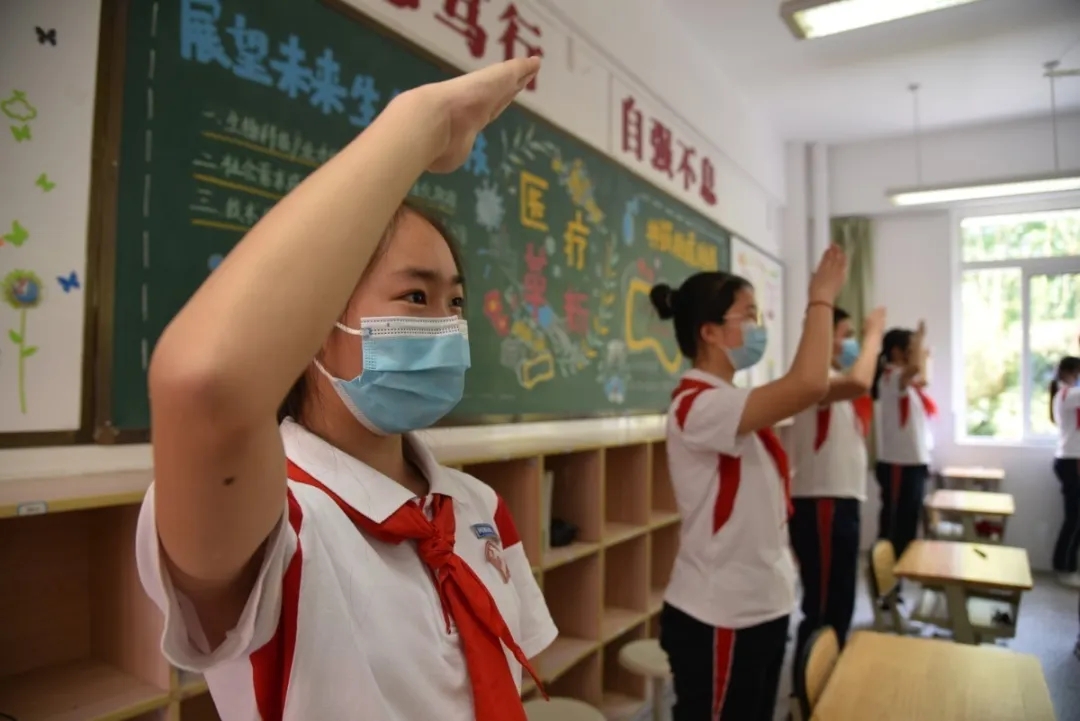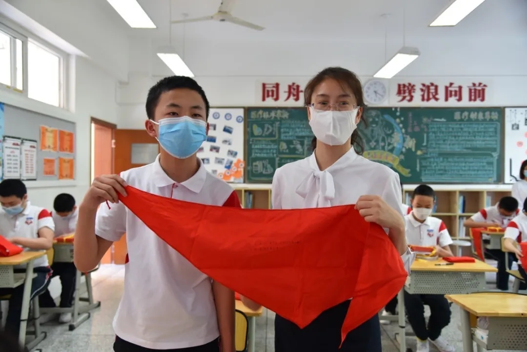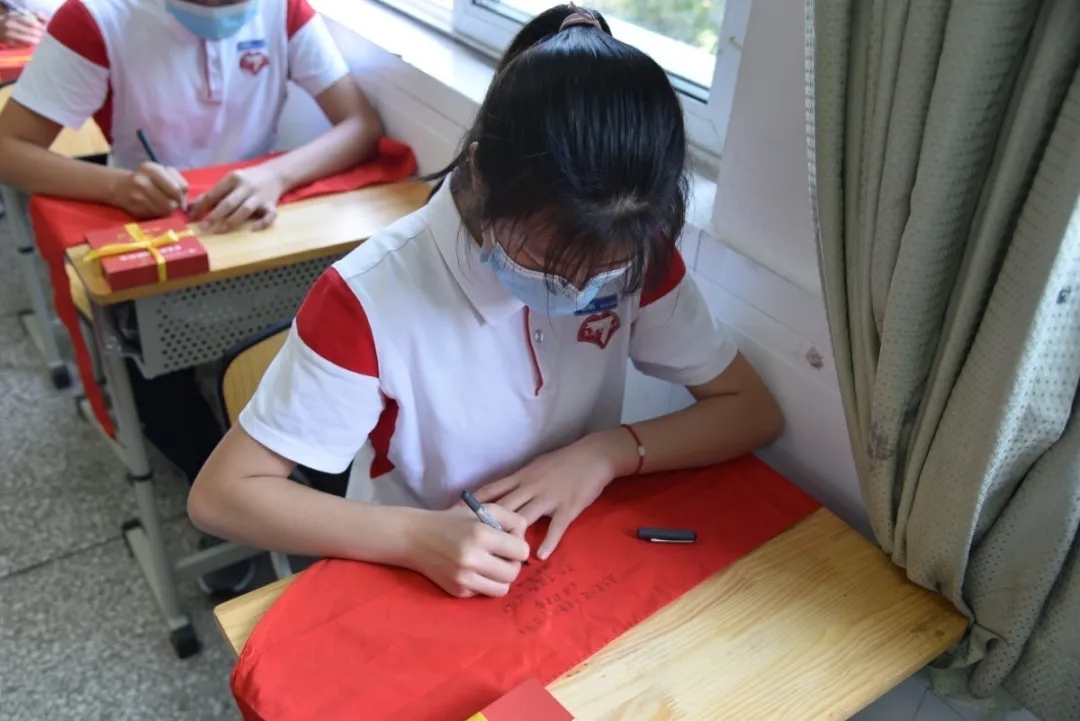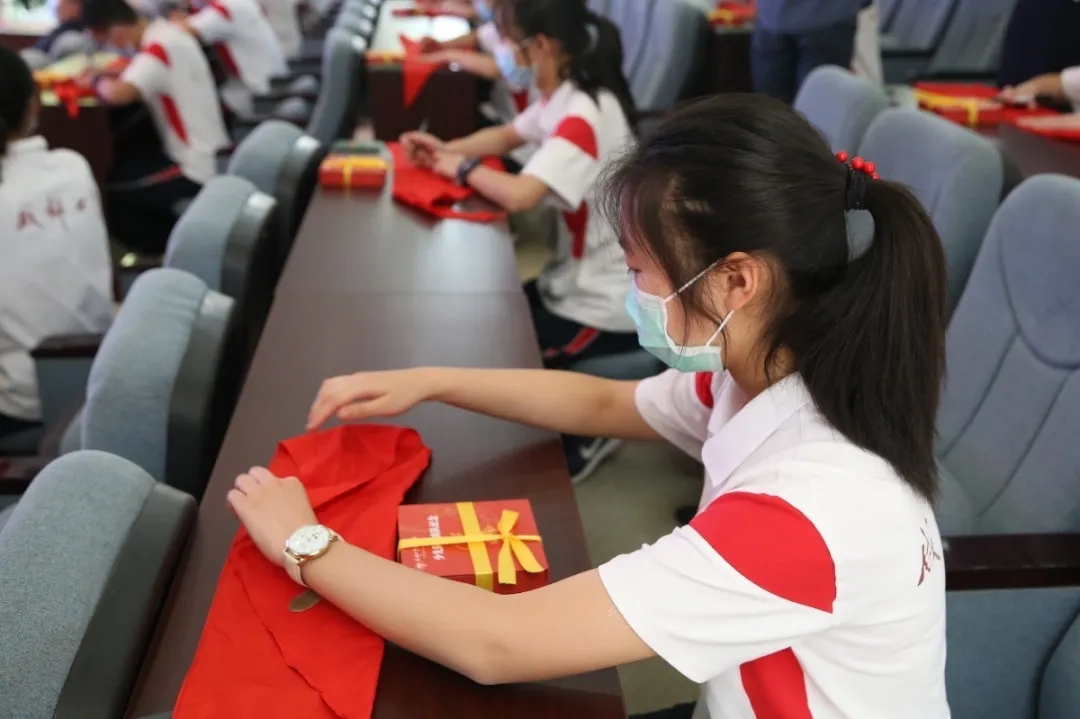 “举起右手,跟我宣誓”学校团委书记何鑫老师带领同学们重温那段童年许下的少先队誓词,那些或感动或难忘的岁月,在此刻都成为了最温暖的记忆。那些对美好童年的纪念,对青春未来的憧憬,此刻都勾画在鲜艳的红领巾上。同学们郑重的将名字和诺言刻下,将那些过往的时光连同红领巾一起珍藏进金色纸盒里,那里装有最斑斓的梦想,最纯真的愿望。这一刻,同学们在庄重的仪式中接受青春的洗礼。