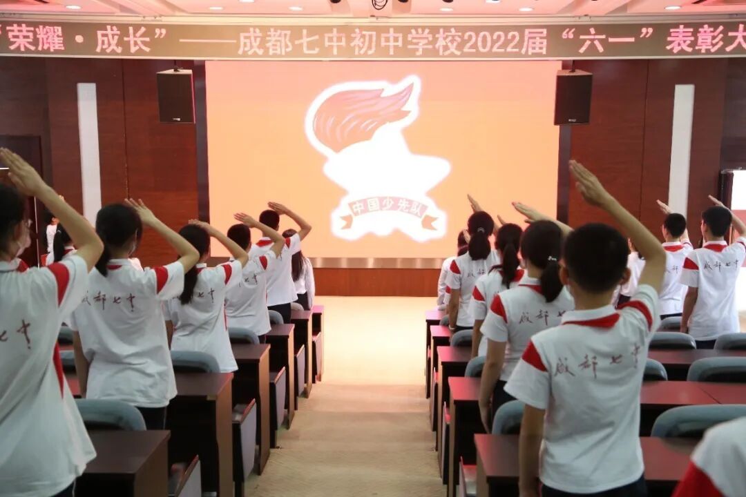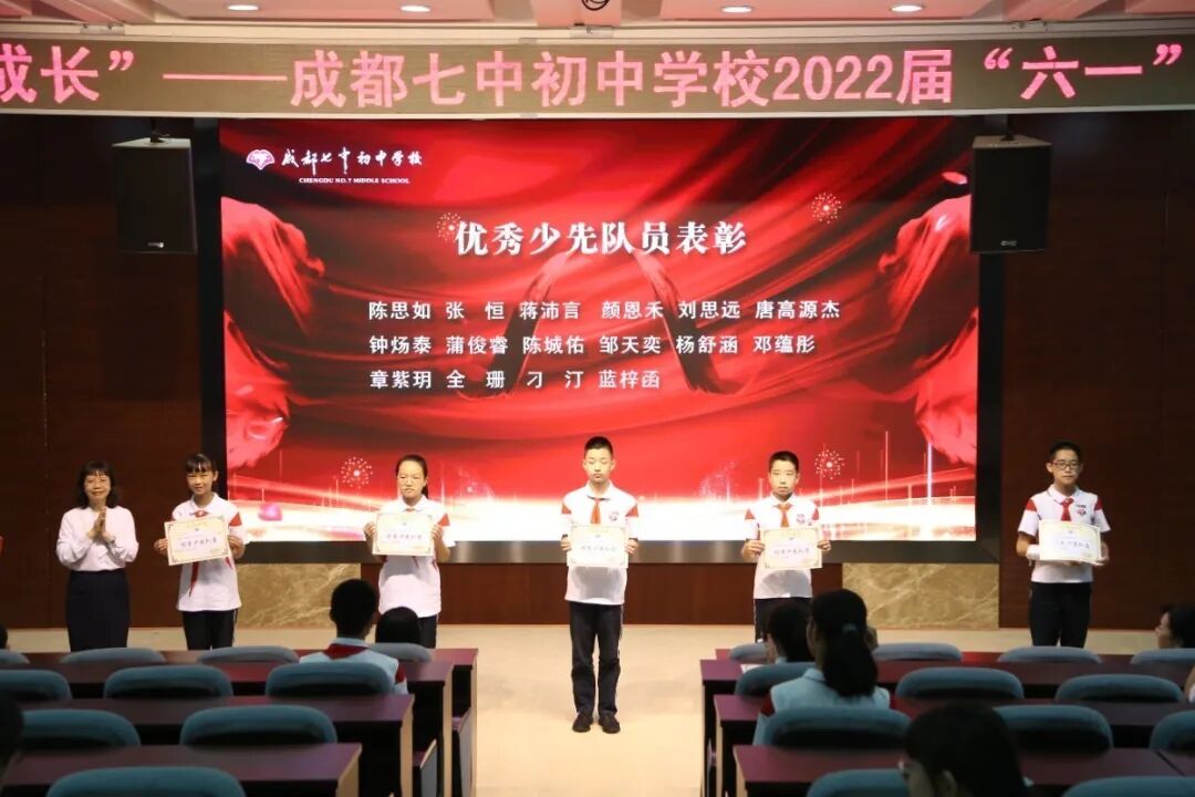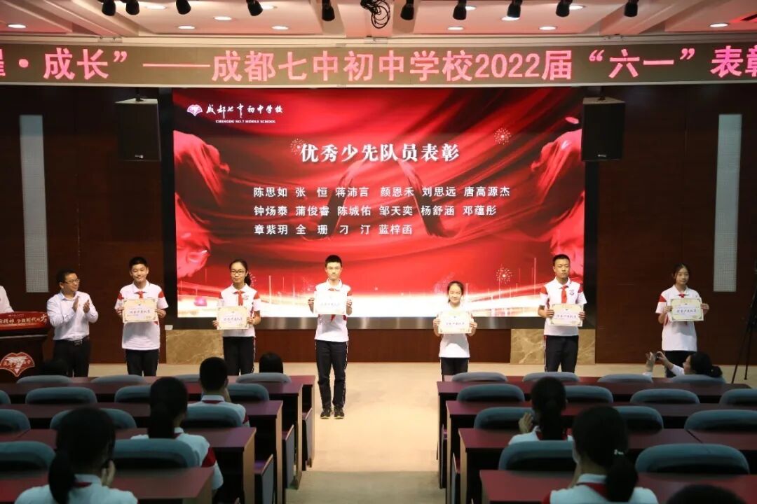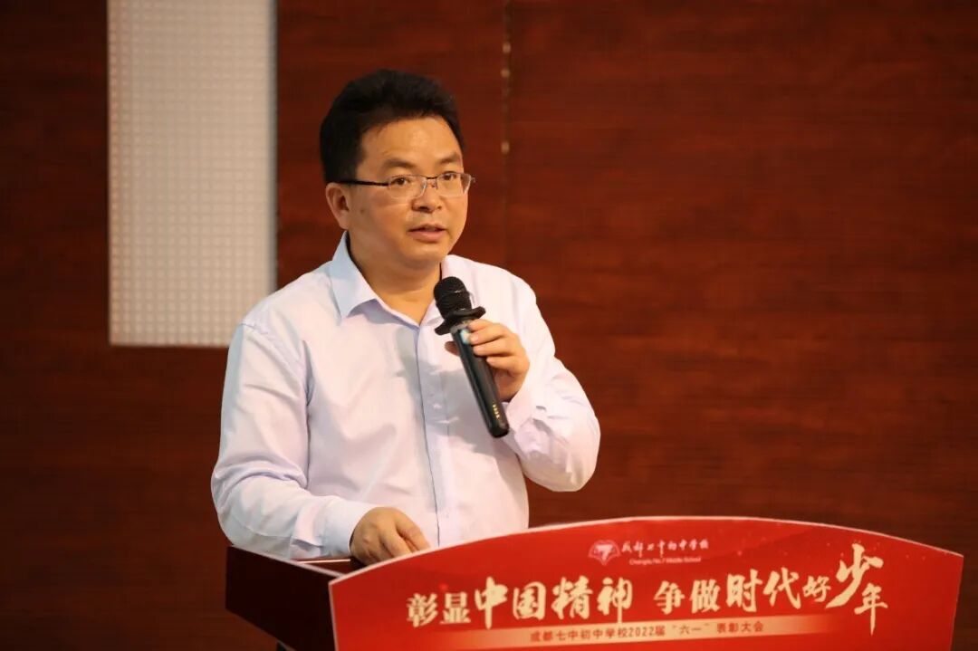 优秀少先队员代表、本部2022届4中队刘思远同学代表受表彰的优秀少先队员发言。谈到一年里的校园生活,刘思远同学激动的说道,“课堂上专注的目光、操场上拼搏的模样、舞台上精彩纷呈的表演,让我们深刻体会到了‘你有多大能耐,七初给你多大舞台’的真切关怀。”刘思远表示,七初的一年,是成长的一年、是进取的一年、更是拼搏的一年,在七初的带领下,我们明白了青春的真正意义,在接下来的岁月里,我们将继续以梦为马,不负青春韶华。