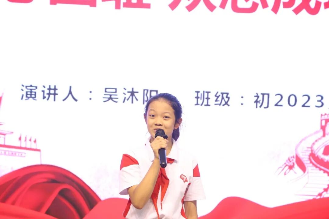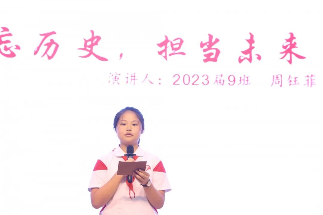 9号选手、2023届9班周钰菲同学娓娓道来、引人入胜,她还呼吁大家不忘历史,居安思危。