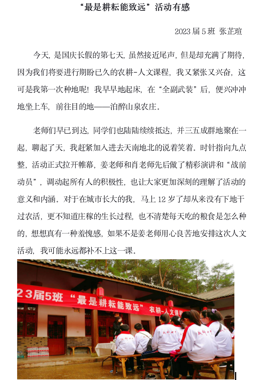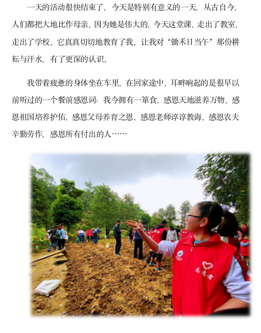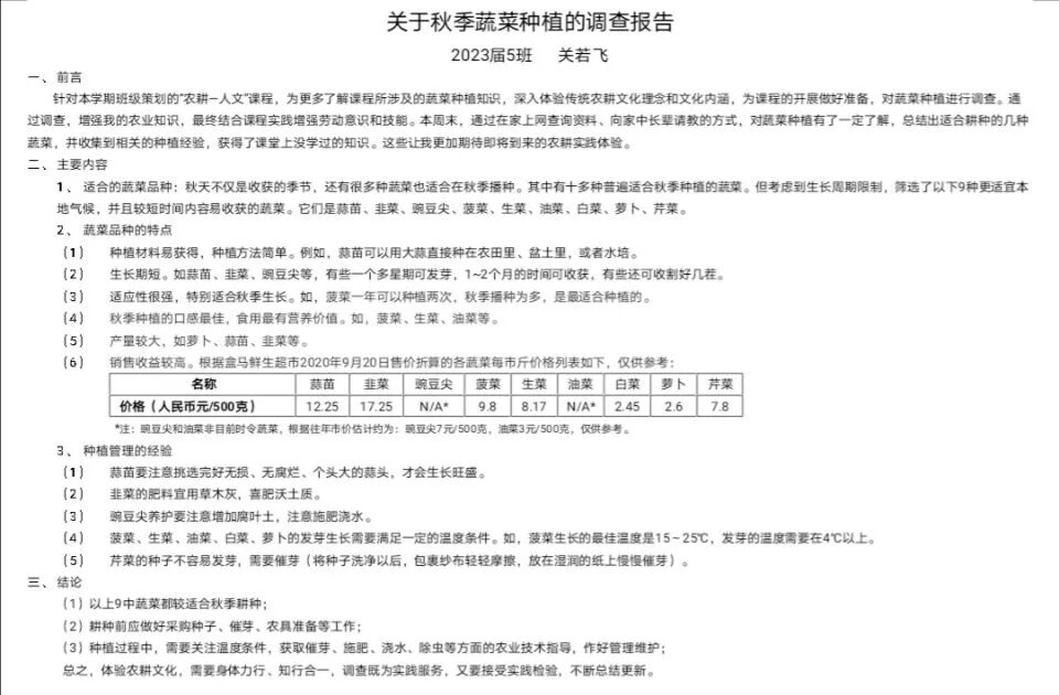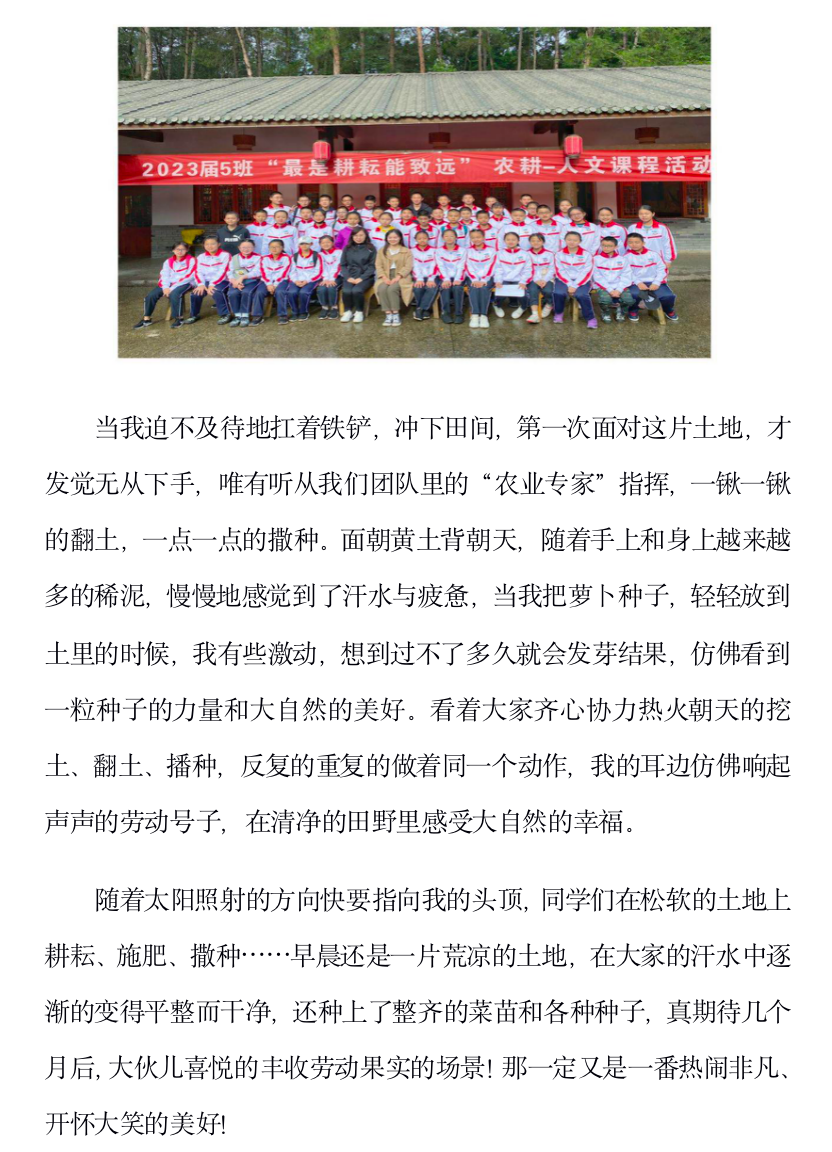 在农耕心得的记录中,同学们不仅写出了劳动活动的丰富多彩,而且写出了劳动情感的积淀深化,领会“幸福是奋斗出来的”内涵与意义,继承中华民族勤俭节约、敬业奉献的优良传统,弘扬开拓创新、砥砺奋进的时代精神。