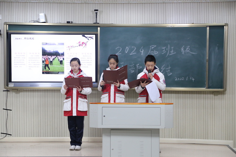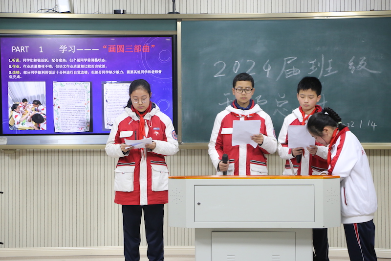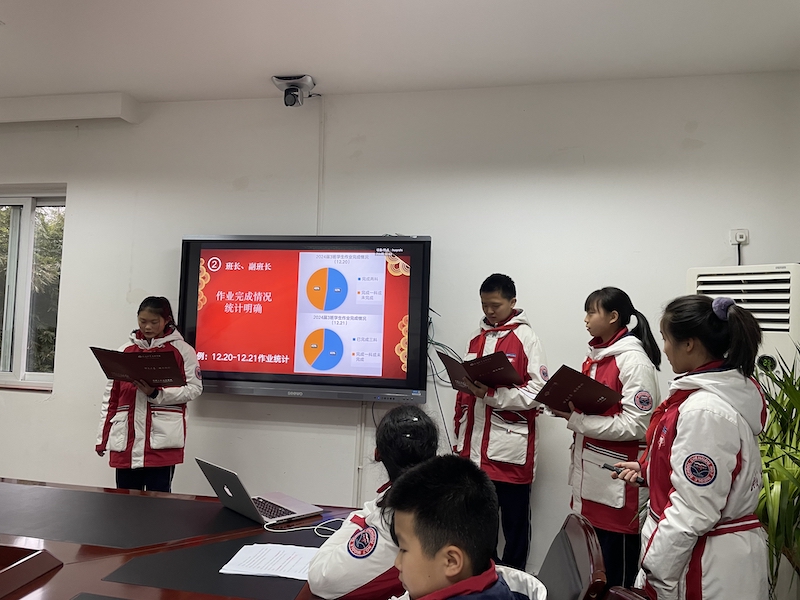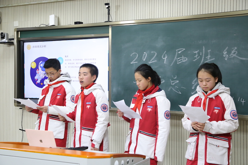 1班班委以“因材施教、团结共进、科学管理”为主题作总结报告,“因材施教,科学管理,团结共进”是班级管理的亮点。