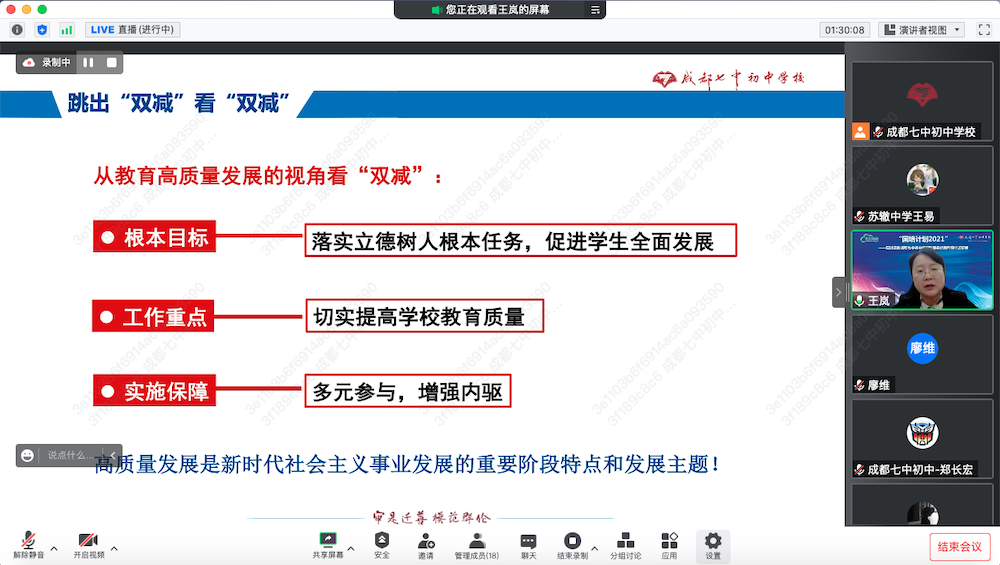 11月8日下午,星空在线登录m星空(中国)副校长、锦城校区执行校长王岚副校长为参训老师做了题为《"双减"背景下,指向学生全面发展的课程变革》的专题报告。王岚副校长结合“双减”背景,为老师们讲述了星空在线登录m星空(中国)的课程改革实施路径,结合具体的案例从学校“是范”课程体系、创生型课堂、课题研究以及作业设计等方面进行了详细的阐述。