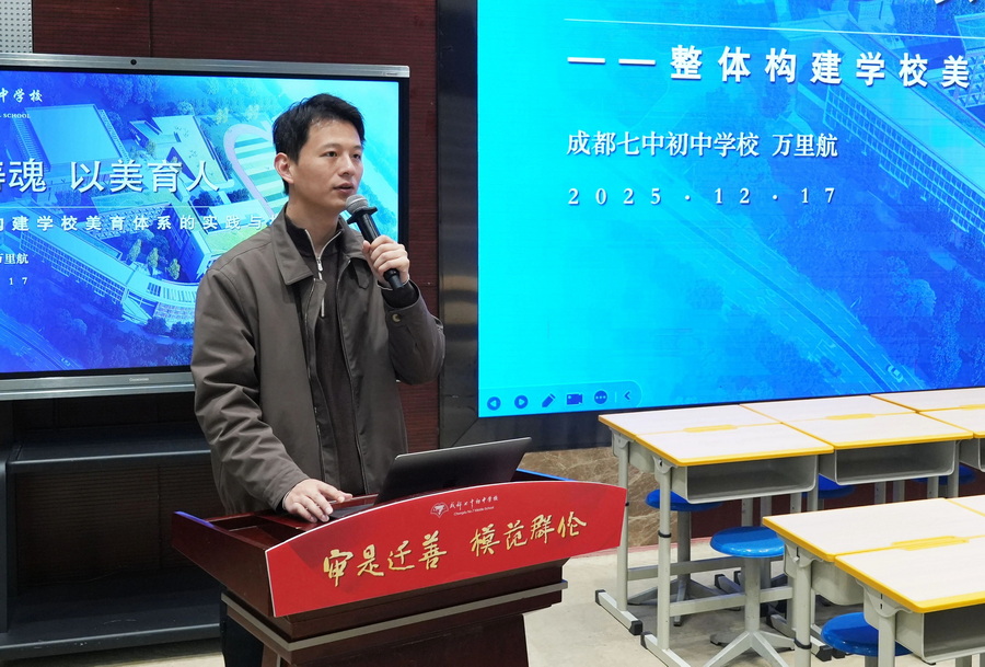 星空在线登录m星空(中国)课程教学中心副主任、艺术教研组组长万里航以《培根铸魂,以美育人——整体构建学校美育体系的实践与探索》为题,向来访代表团系统阐述了学校美育课程建设思路与特色。学校通过课程构建、教师培养等多元举措深化美育工作,重点从“立德树人厚植美育精神、面向人人构建大美育课程、多措并举推进美育工程、家校社共创美育生态”四大维度实践,形成学校美育新生态。